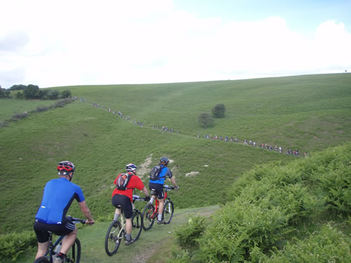 Following the mass start the riders rode upwards to the top of the hill before descending down the back side and then following a roller coaster of climbs and descents round the back of the hill. Thankfully the course was bone dry so the mixture of narrow jeep track and grassy banking was as hard as concrete making progress easy, the climbs enjoyable and the descents eye wateringly quick. Fortunately the sheep seemed to be keeping well out of the eight hundred riders tearing through their back yard so there were no "bike rack" incidents repeated from Saturday night. However, on one of the descents, a relatively straight forward but rather steep and slightly rutted descent, I saw one rider completely lose control and go over the bars with the bike appearing to 'buck him' off and then two other groups of half a dozen or more riders who were rubbing ankles, gathering up items jettisoned from their back packs or generally rubbing their heads and wondering where their bike was. No one looked like they couldn't carry on and I have to admit it looked a little strange how so many had come a cropper so I guess it was just down to "banging bars" with others.